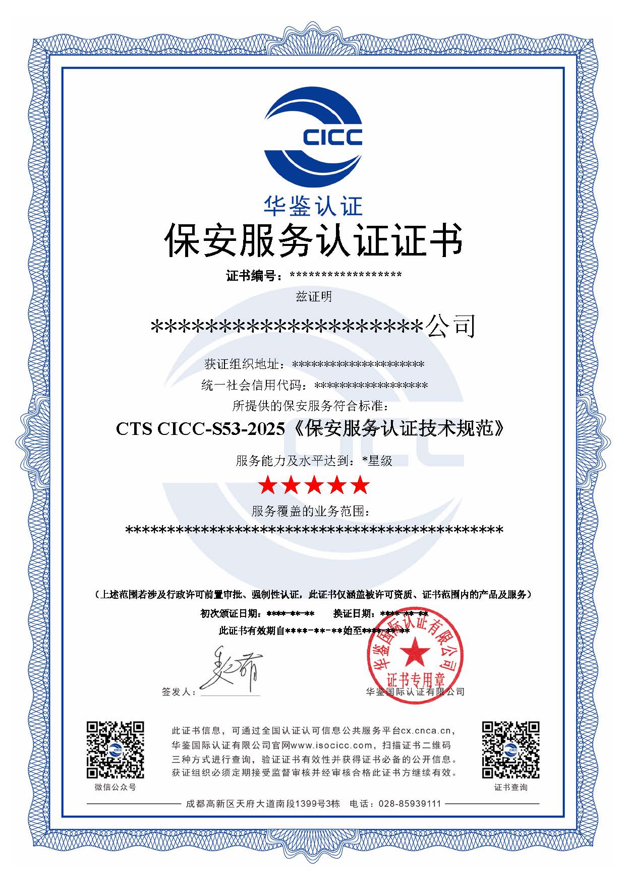 保安服务认证还可以推动保安服务企业建立完善的管理制度,更加顺利通过资质许可,助力保安服务企业顺利中标银行、政府、行政和大型企事单位的保安服务项目。提升保安服务企业管理水平、服务质量、社会影响力,并提升企业的竞争力。保安服务认证是对组织保安服务符合 CTS CICC-S53-2025 要求的一种认证。这是一种通过权威的第三方审核之后提供的保证:受认证的组织实施了保安服务,并且符合 CTS CICC-S53-2025 标准的要求。
