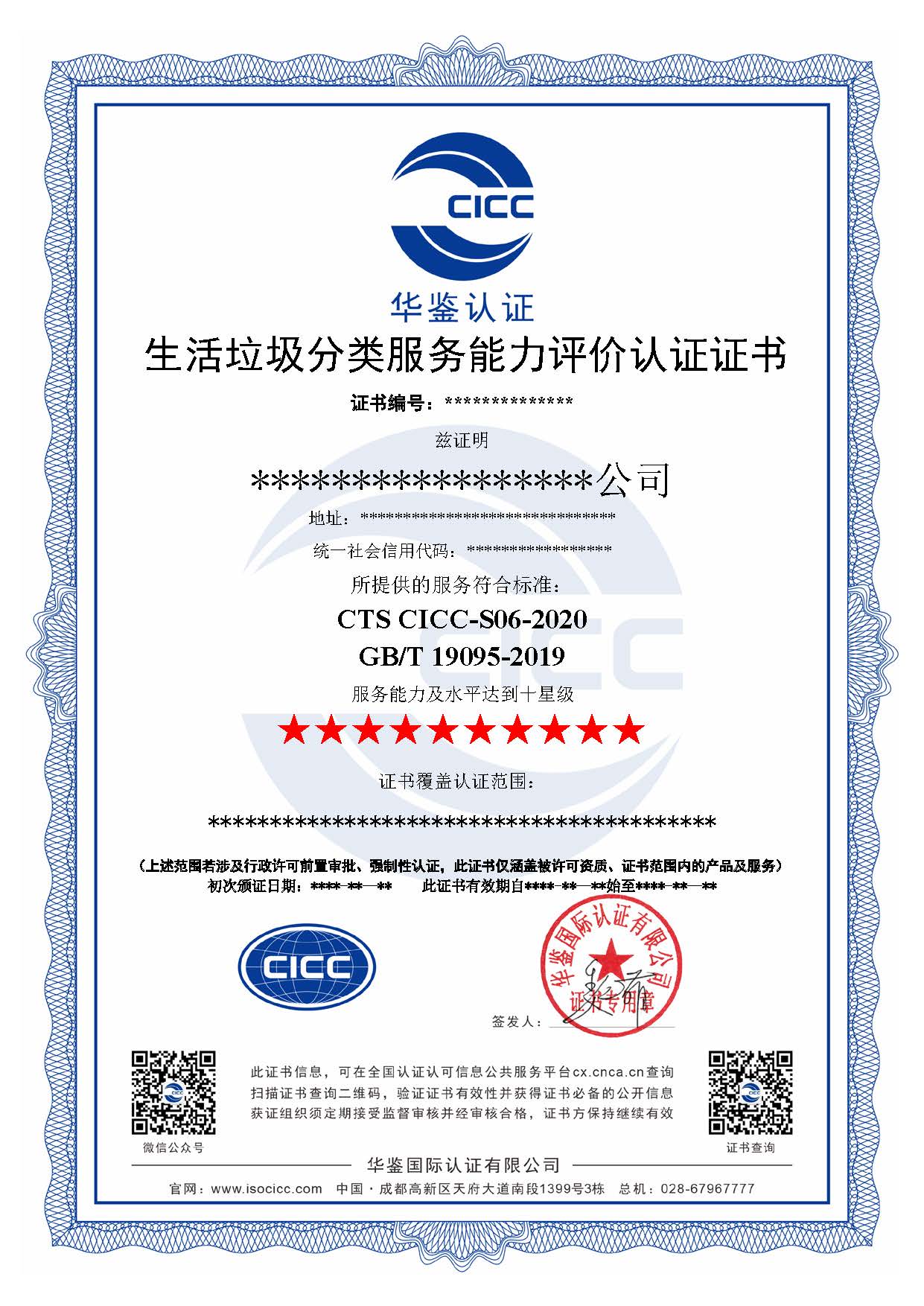 生活垃圾分类服务能力认证证书是认证认可监督委员会批准的认证机构对企业开展垃圾分类服务能力认证评定。
