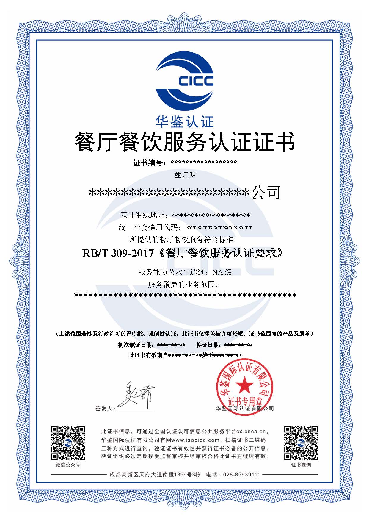 RB/T309餐厅餐饮服务认证