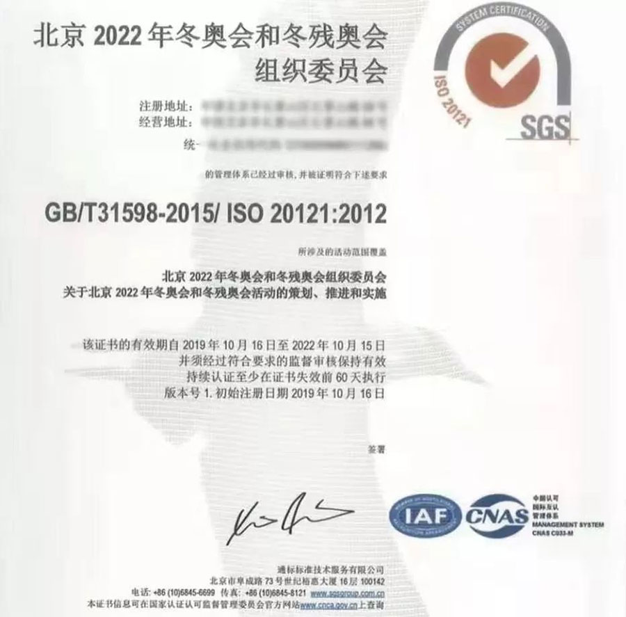 认可作为国家质量基础设施的重要组成部分,积极发挥技术支撑作用。中国合格评定国家认可委员会(CNAS)从2017年初就派出人员参与北京冬奥组委可持续性管理体系的建立工作,参与和见证了从体系的策划、建立、到运行实施以及认证审核的全过程。2018年底,CNAS建立起大型活动可持续性管理体系认证机构认可制度。今年10月,CNAS向服务北京冬奥组委可持续性管理体系认证申请工作的机构SGS颁发了我国首张大型活动可持续性管理体系认证机构认可证书,为北京冬奥会提供认可技术服务。