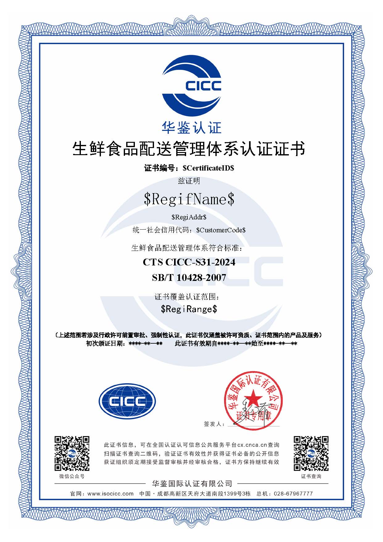 获得生鲜食品配送管理体系认证证书的企业,表明其管理体系和产品质量已得到权威机构的认可,有助于增强消费者对企业的信任,提升企业的市场竞争力。总之,生鲜食品配送管理体系认证证书是对企业生鲜食品配送环节质量安全管理的一种有效认证。